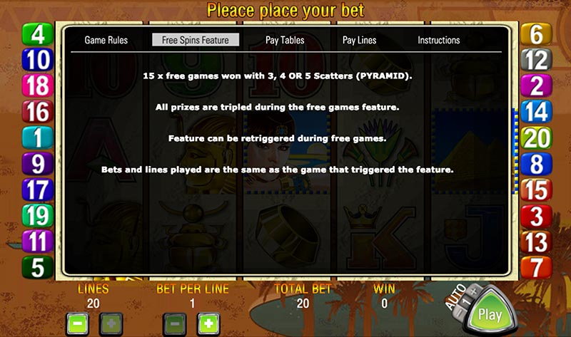 The most important symbol in the game is the scatter. Land three or more pyramid scatters anywhere on the reels, and you trigger the free spins bonus. This is where the pokie really comes alive.